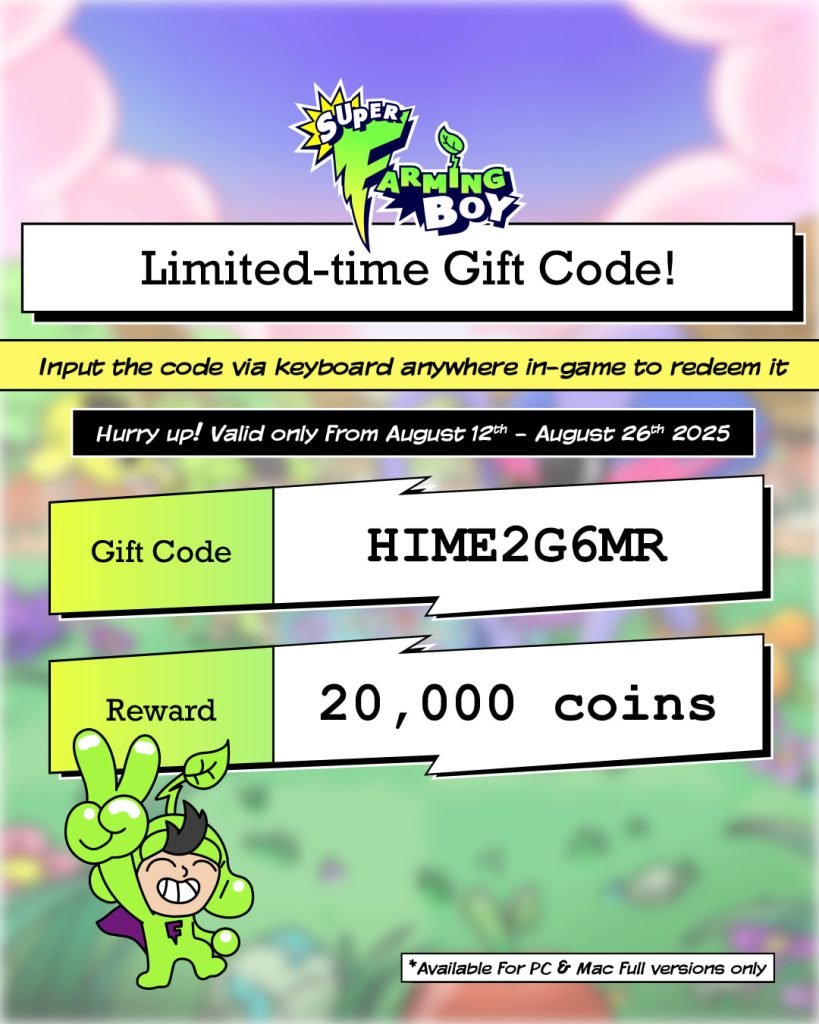 The creators have also kindly extended a gift code to me, so when you decide to try it, you can use code HIME2G6MR to claim 20,000 coins! This code is for PC and Mac full versions and valid until 26th August 2025. They can be used once per save slot. Just keep in mind that 20,000 is a significant amount in the early game, so if you want to experience the full hustle of Super Farming Boy, you can consider holding off claiming the codes too!