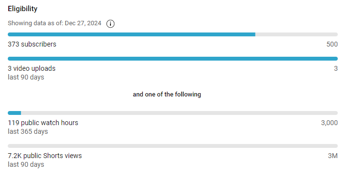But first, we have to hit Youtube Partner! Which will require us to hit 500 subscribers and 3,000 watch hours (including livestreams and video watchers). Currently, our progress is as such: