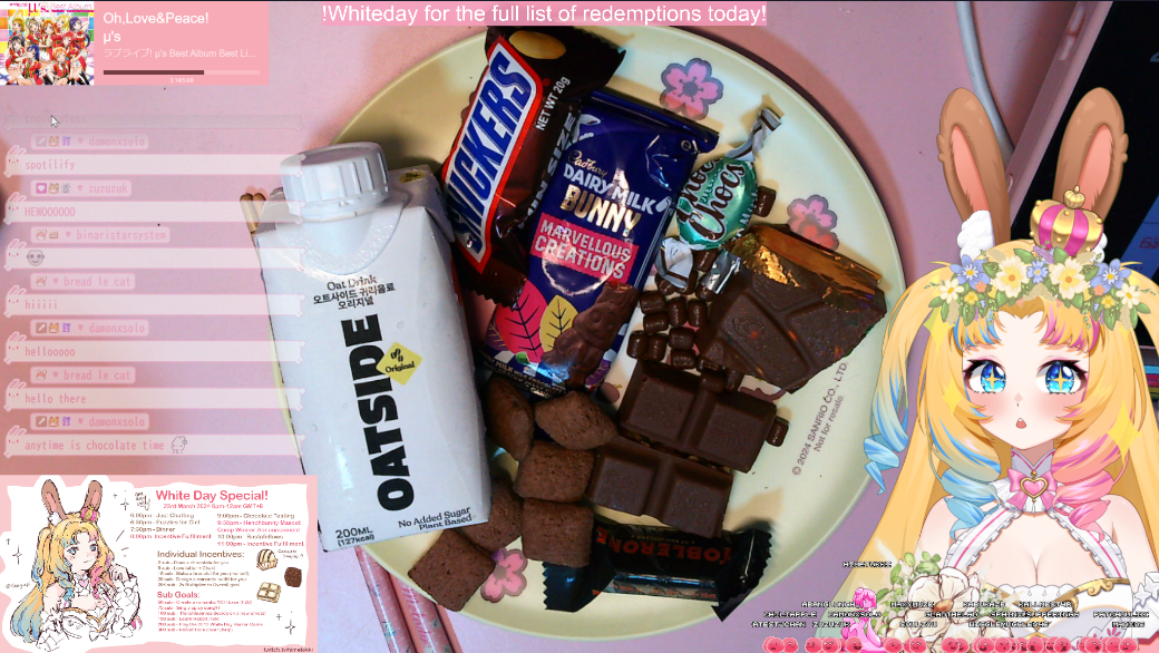 A 6 hour stream for White day which was more of an excuse to eat chocolates and play bunny-related games and visual novels! I drew a chocolate based on our supporters, which is similar to last year’s white day, but with a little more design thoughtfulness needed! I ate sooooo much chocolate that night… aaa